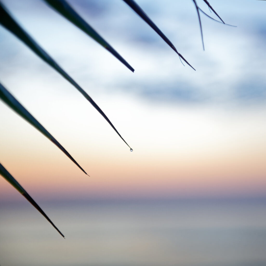 2022. No, I had not leapt out of bed, nostrils flared with inspiration, to capture THE shot of the solitary fisherman cutting across a glassy sea in the morning mist. It was a lecherous, idiotic common koel in full rut, firing on all cylinders, that had cut far too short — with its unbearable screaming — an already restless night, during a period of deep post-covid weariness. On top of that, this was less early morning than the dead of night: stray dogs lazily hauled themselves out of their hollows in the sand to come limping over and sniff this first human presence of the day, at once bewildered, begging and contemptuous — while passing on their fleas and already exhaling putrid fumes. I had left the comfort of the air-conditioned room, and at that hour there was not the slightest breath of air. Besieged by mosquitoes, my t-shirt already heavy with sweat and my backside soaked (having foolishly sat on a dew-covered bench to change lenses), I was trying to shelter under the palm fronds from the rays that would soon be breaking through. As so often in those moments when you are anticipating a shot, a different idea comes instead: a fine irony that those pointed leaves offered no shelter at all, and were even making a nuisance of themselves by channelling all the night's moisture straight down my back. The fisherman naturally headed off in a direction that did nothing for me, the lens — too cold — fogged over... I missed every single drop shot: dozens of them, all blurred. Except this one — the least impressive of the lot, but it was the last, already tiny: almost water vapour already, the very last little drop of the night.